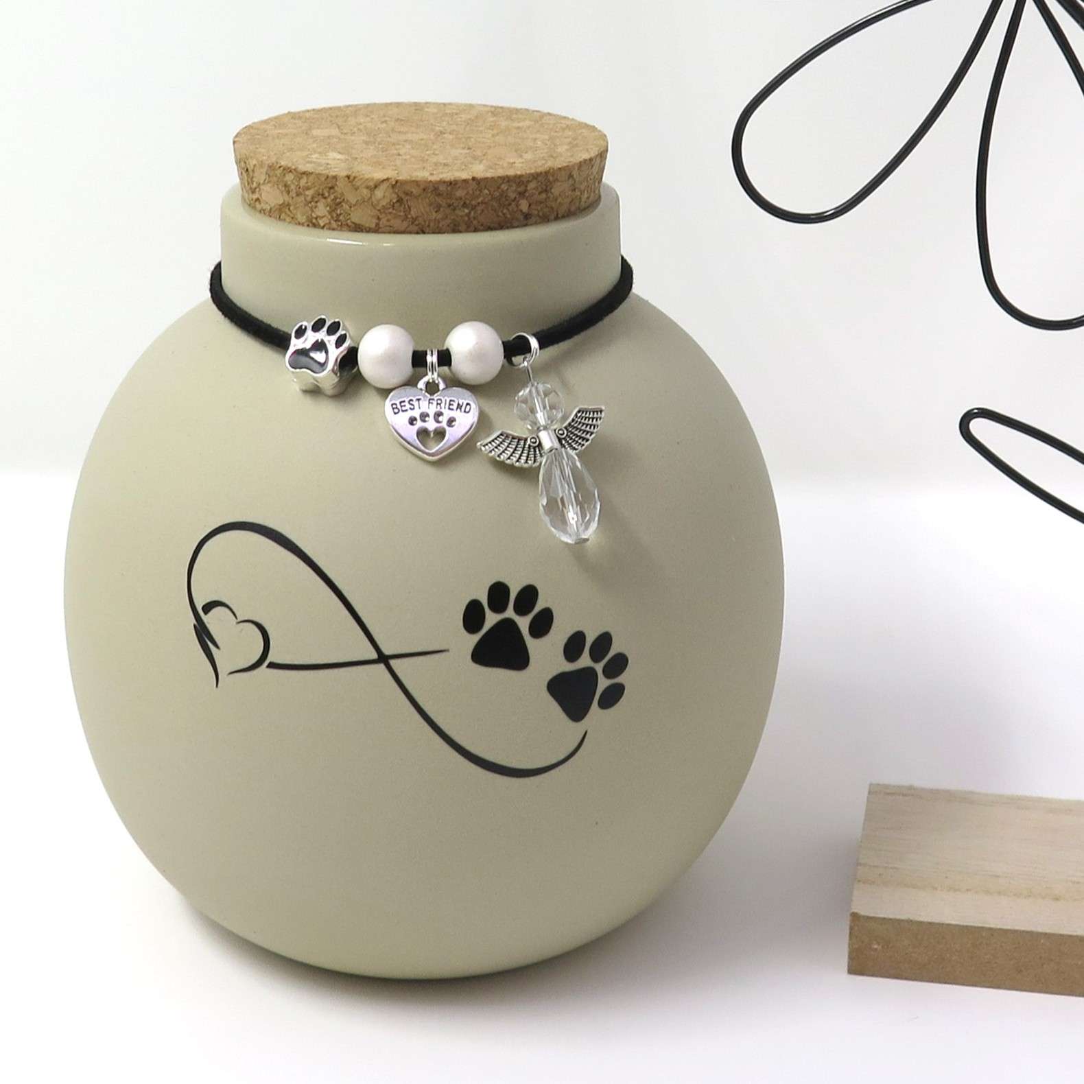 Diese besondere Tierurne wurde liebevoll mit einem niedlichen Motiv veredelt, das die Endlose Liebe zwischen Ihnen und Ihrem Tier darstellt.