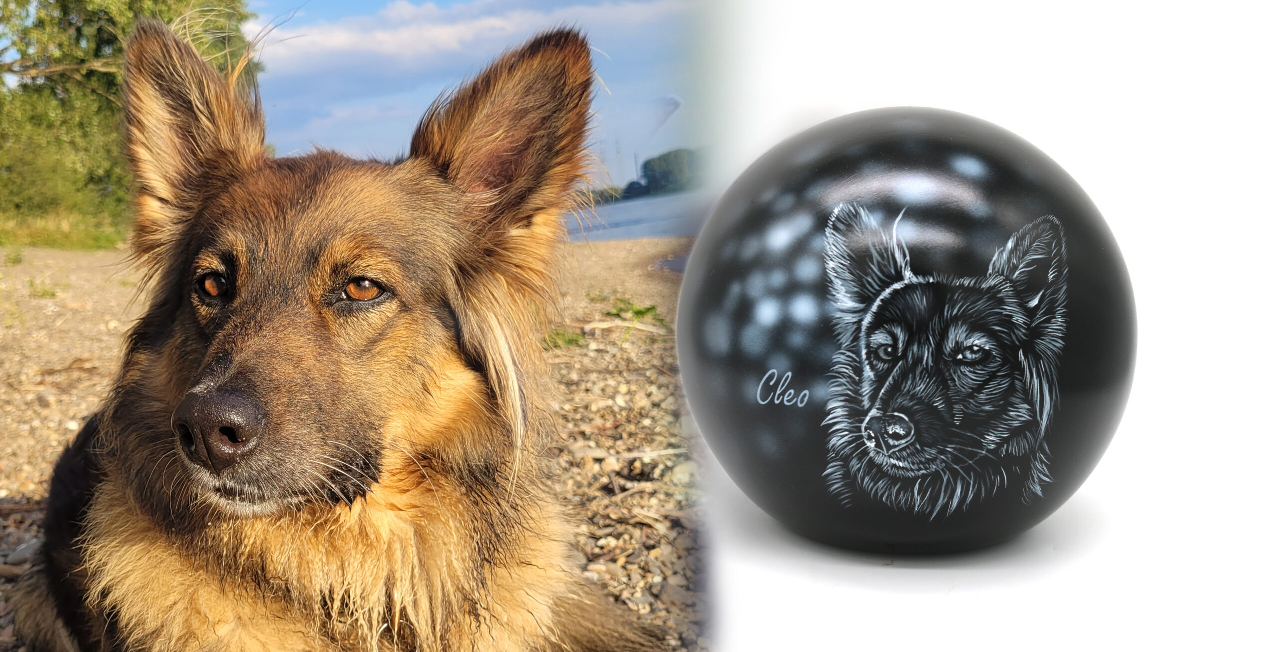 Diese Tierurne in Form einer Kugel wurde liebevoll mit einem Hund im Lichterschein bemalt, nach Fotovorlage Ihres Hundes.