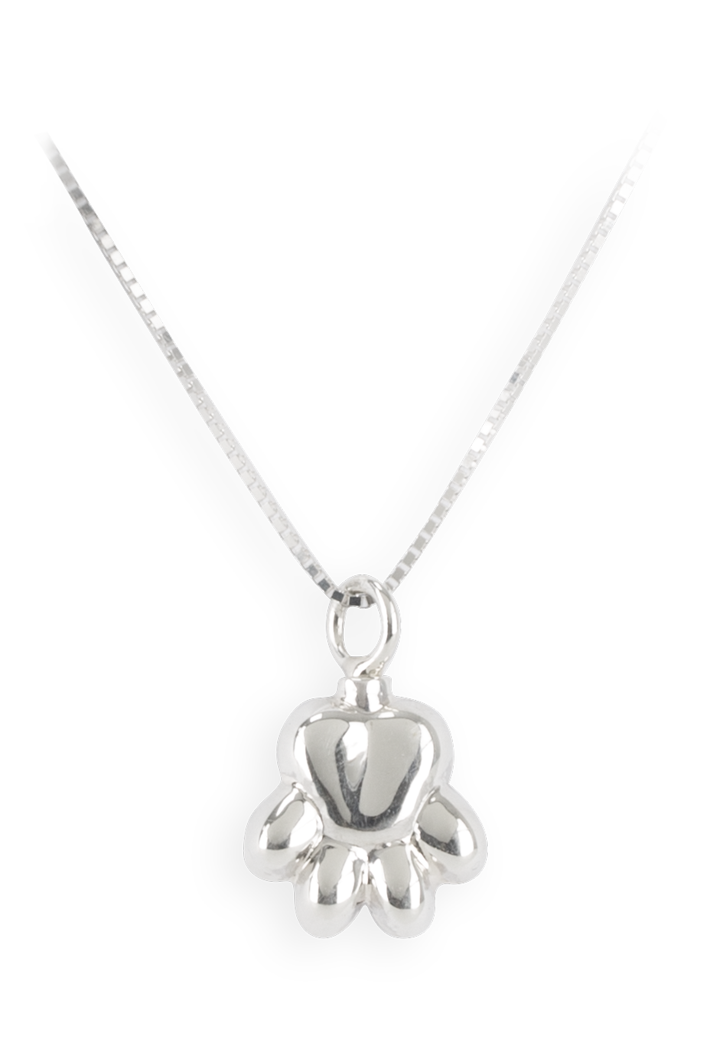 Dieses Am-Urn-Let, sowie die 50cm Kette ist aus 925er-Sterlingsilber gefertigt und hat die Form einer Pfote.