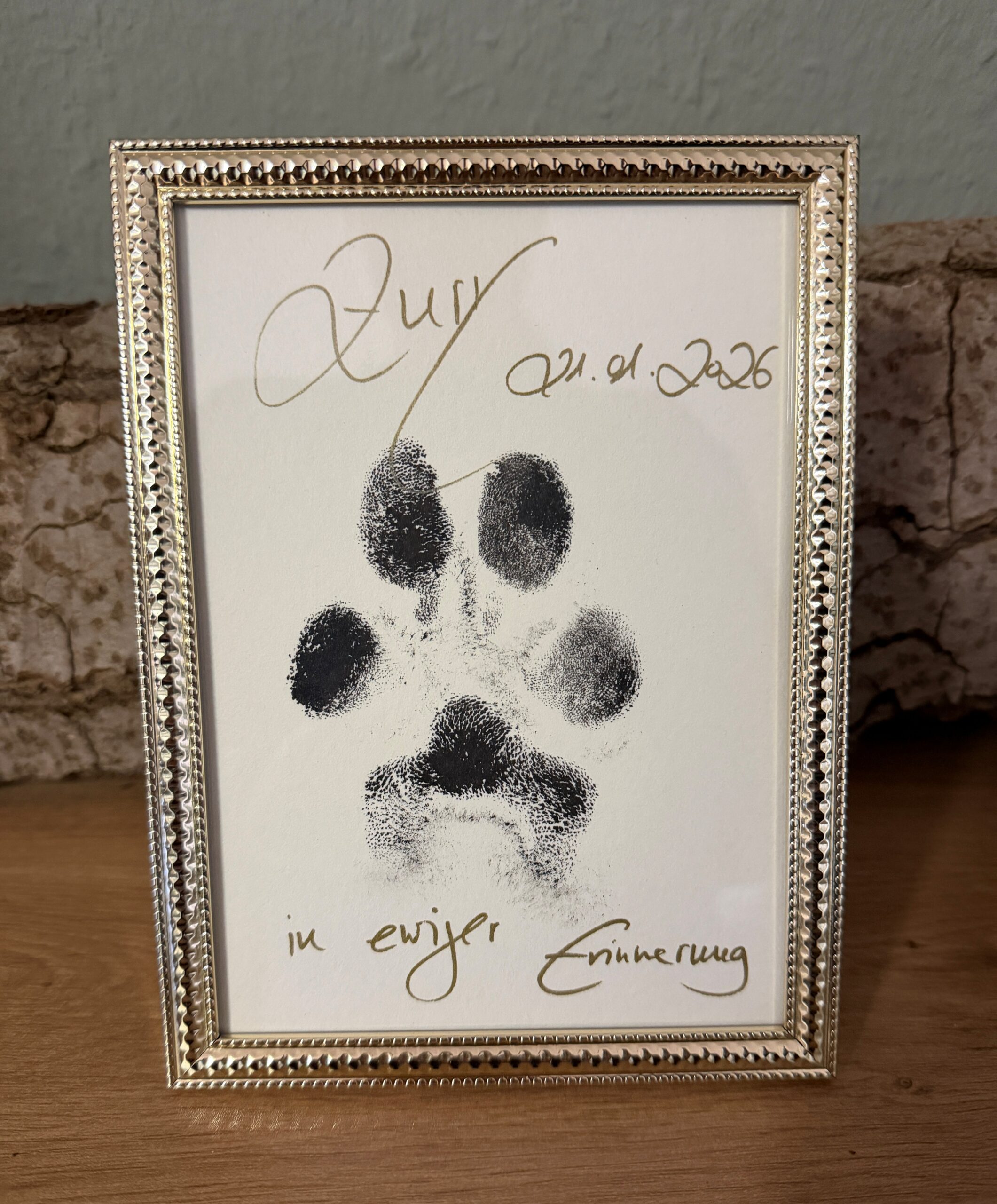 Auf Wunsch kann der Abdruck individuell beschriftet werden – beispielsweise mit dem Namen Ihres Tieres, einem Datum oder einer kurzen Botschaft.
