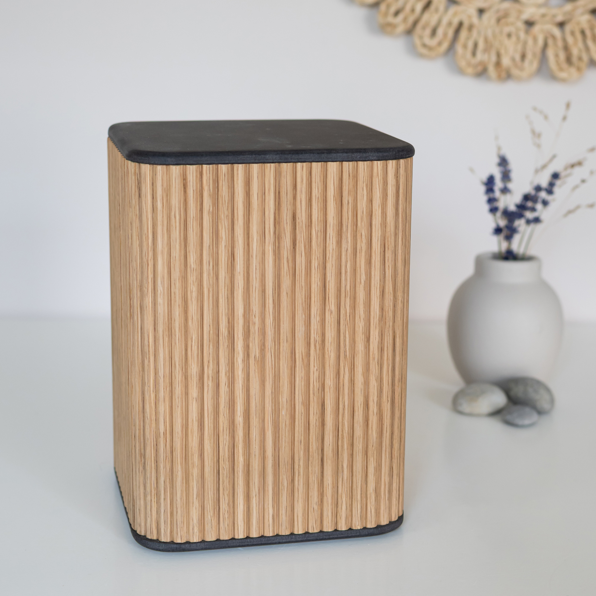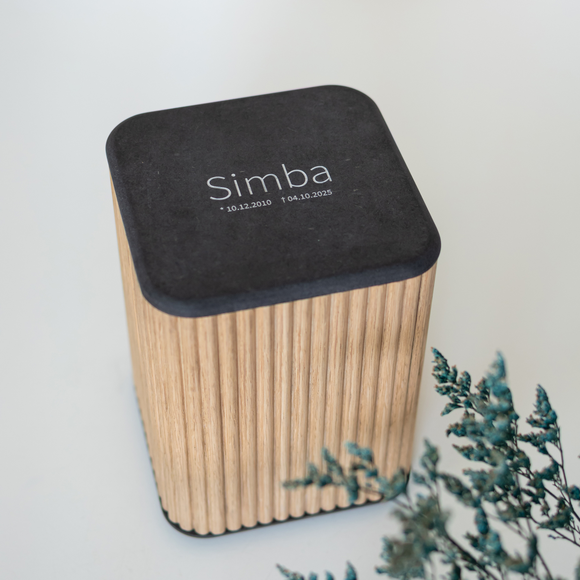 Diese Tierurne mit einem Korpus aus Eichen-Echtholz und einem Deckel & Boden in tiefenschwarz ist besonders harmonisch und warm.