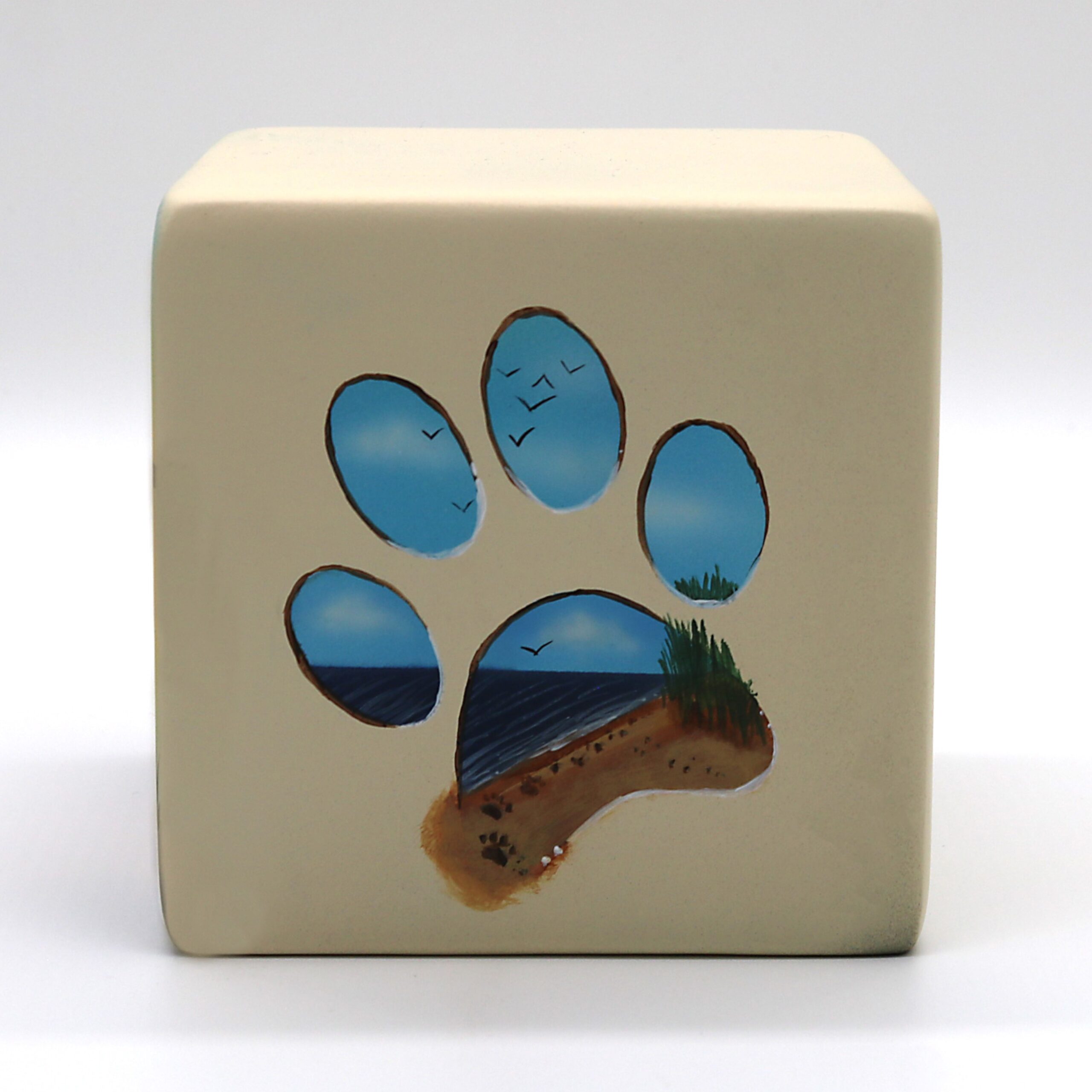 Diese einzigartige Tierurne zeigt den Blick ins Paradies, eine wunderschöne Landschaft zeigt sich durch eine niedliche Pfote, liebevoll von Hand bemalt.