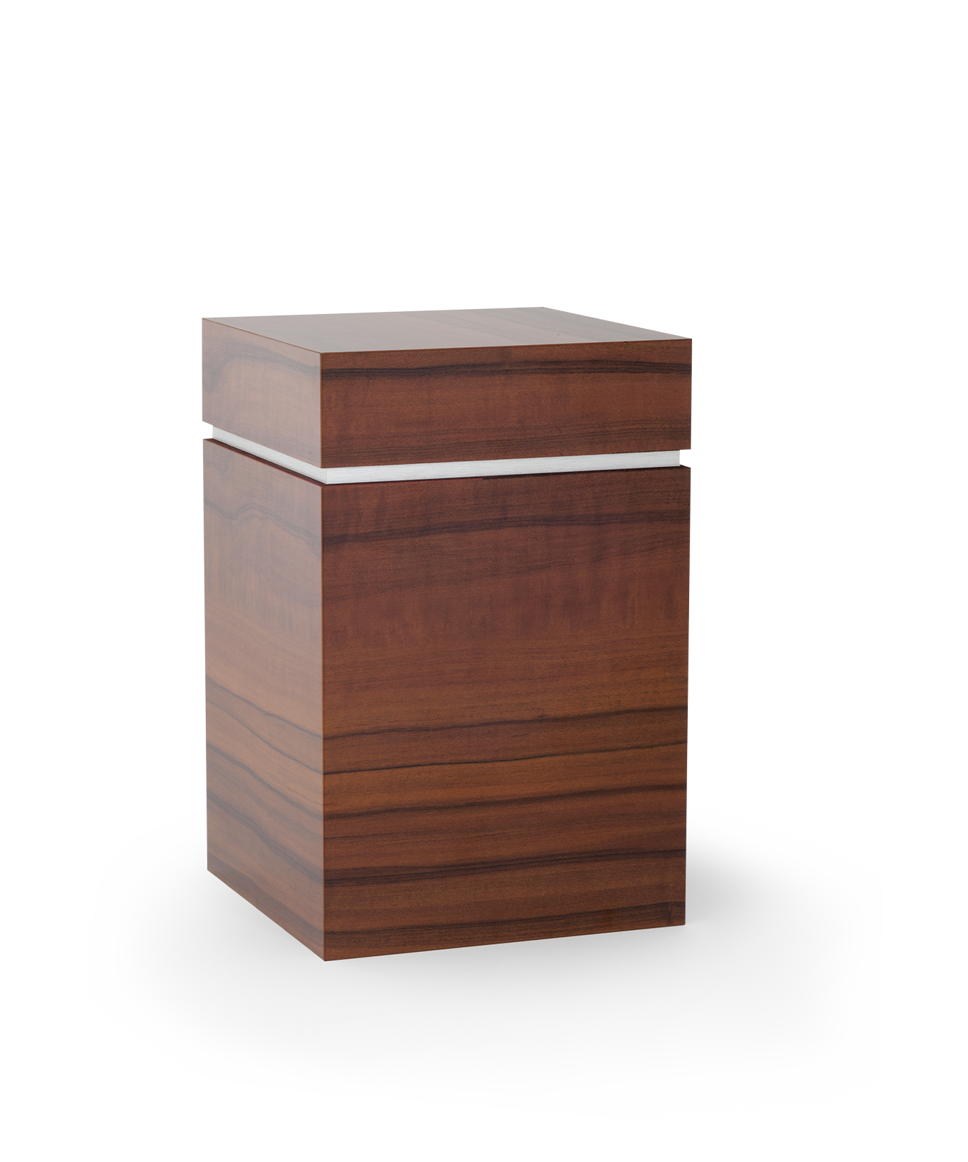 Die Urne ist mit einem hochwertigen Laminat in der Holzoptik „Olive Sevilla“, „indischer Apfel“, oder „Wengo Bonobo“ beschichtet. Verziert wird sie durch einen mattierten Silberstreifen in der Schattenfuge.