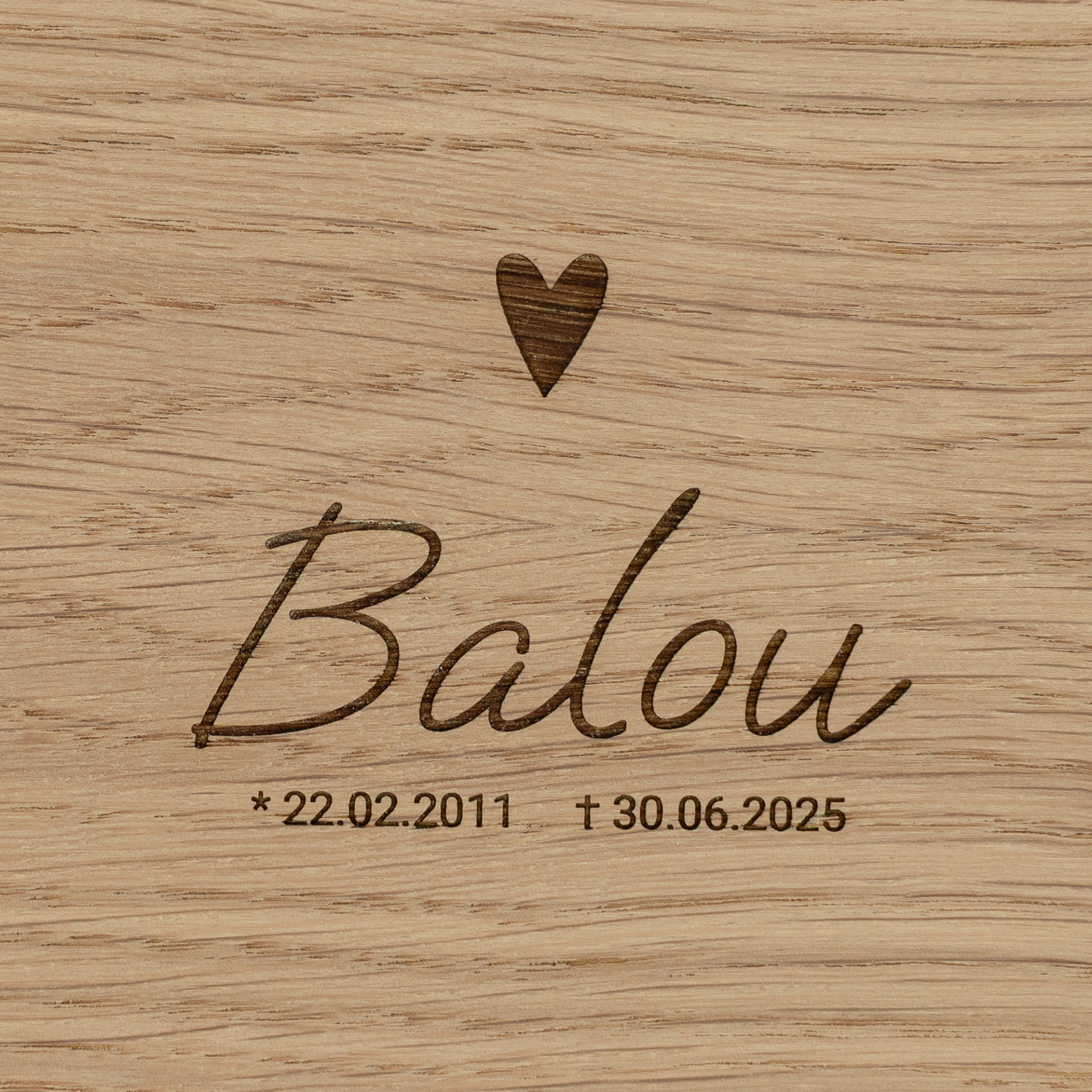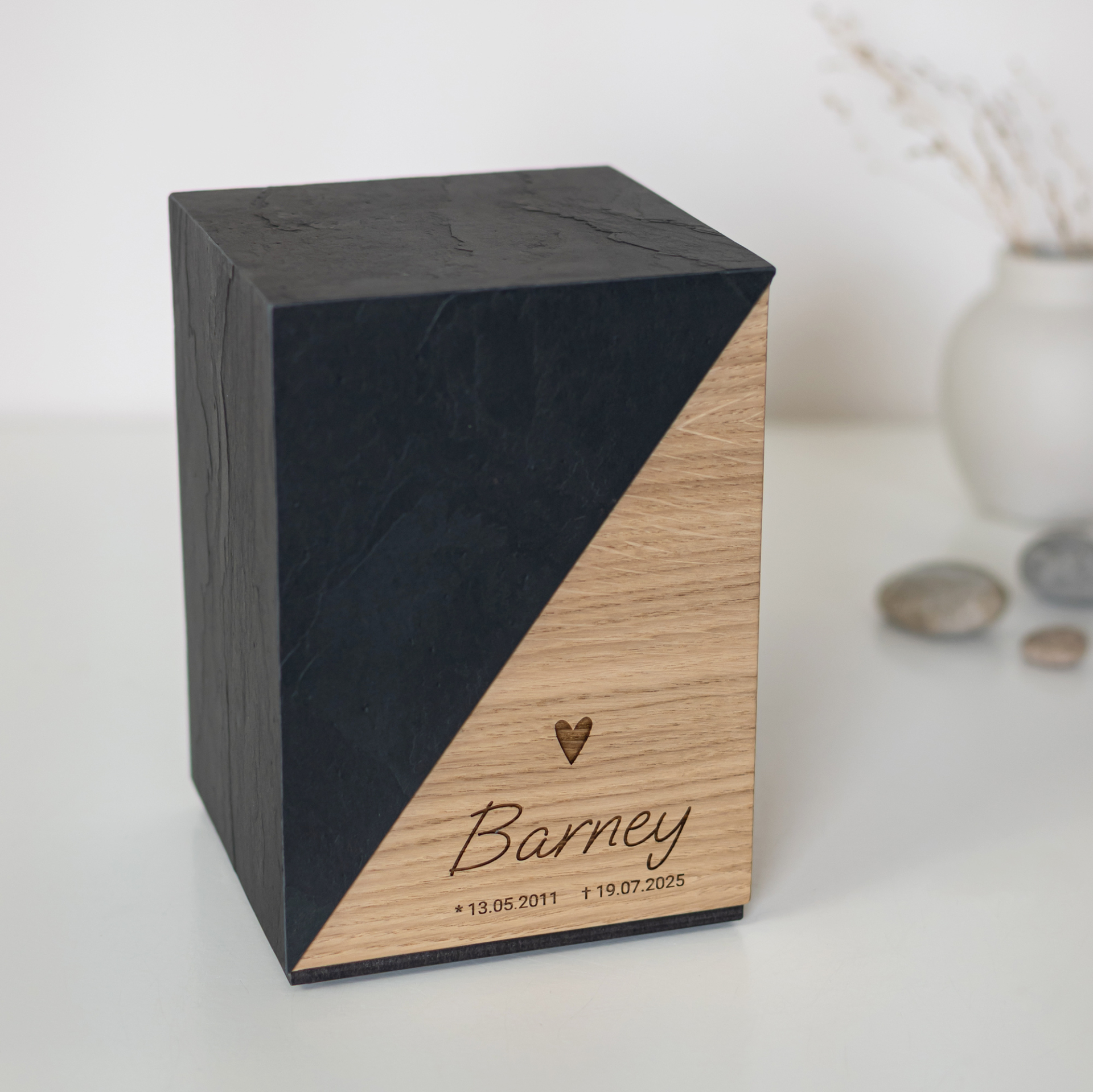 Die Tierurne, bestehend aus Eiche und Schiefer, ist eine moderne Ascheaufbewahrung für Ihren Liebling.
